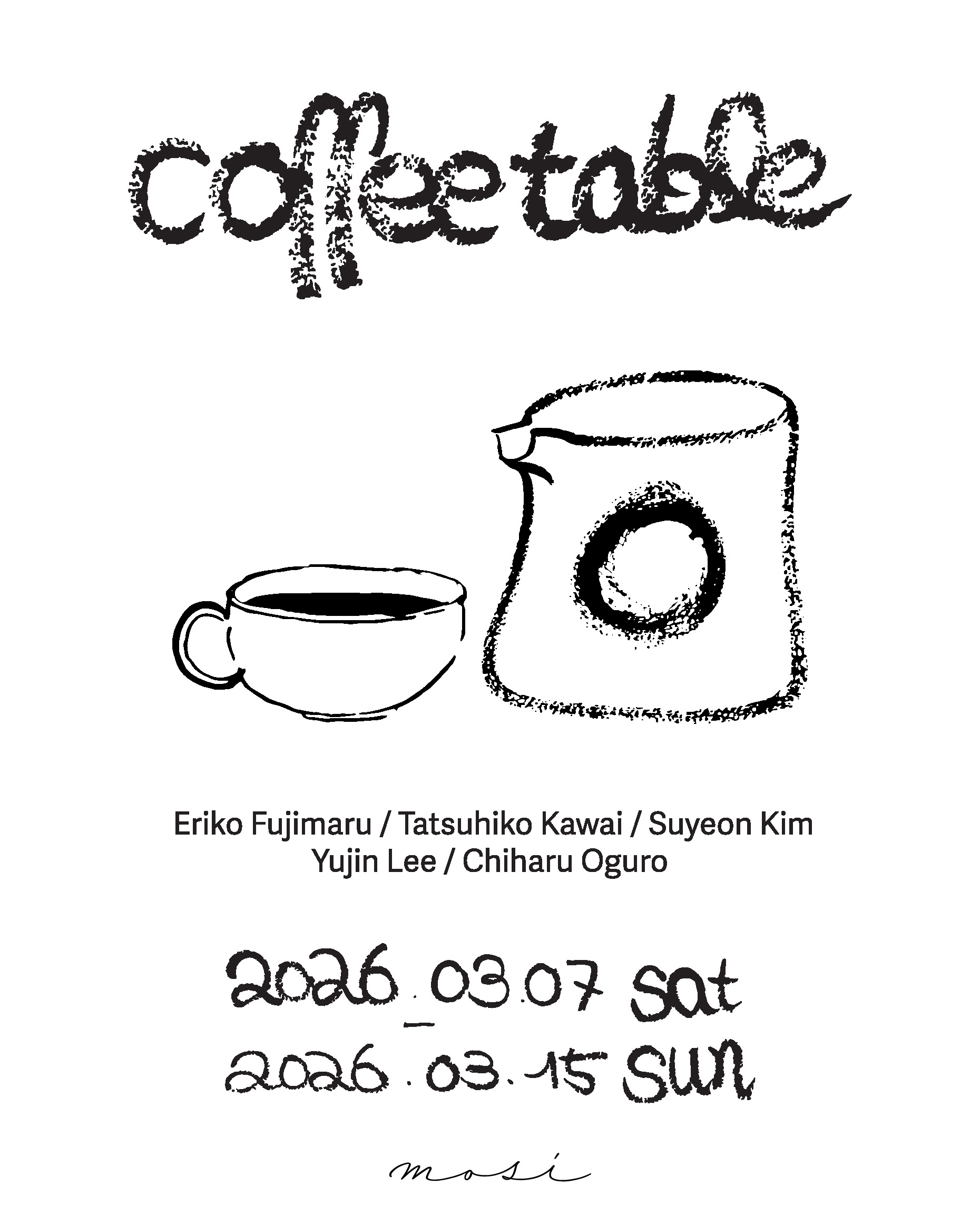 Coffee Tablegroup pop-up exhibition3.7 (sat) - 3.15 (sun) ・Eriko Fujimaru・Tatsuhiko Kawai・Suyeon Kim・Yujin Lee・Chiharu Oguro 커피 테이블이란 주제로 5명의 작가들의 작업을 모았습니다.커피 한잔이 떠오르는 따뜻한 테이블 위에 어울리는 각각의 기물들.하루를 여는 커피 한 잔처럼,이번 전시가 다가오는 봄의 시작과 함께작은 설렘이 되기를 바랍니다.