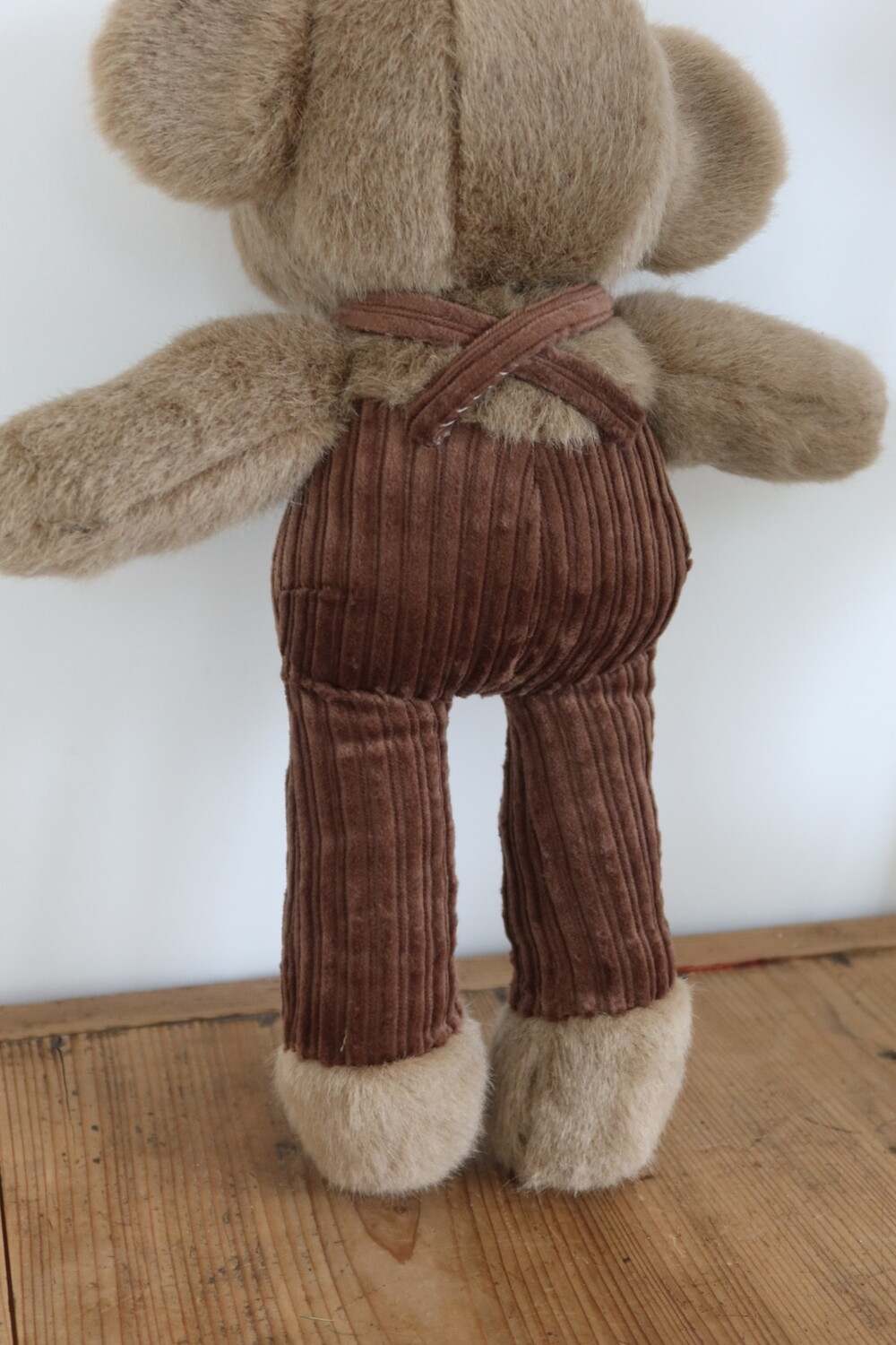 골덴 소재의 멜빵바지를 입고 있습니다.